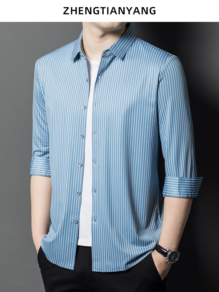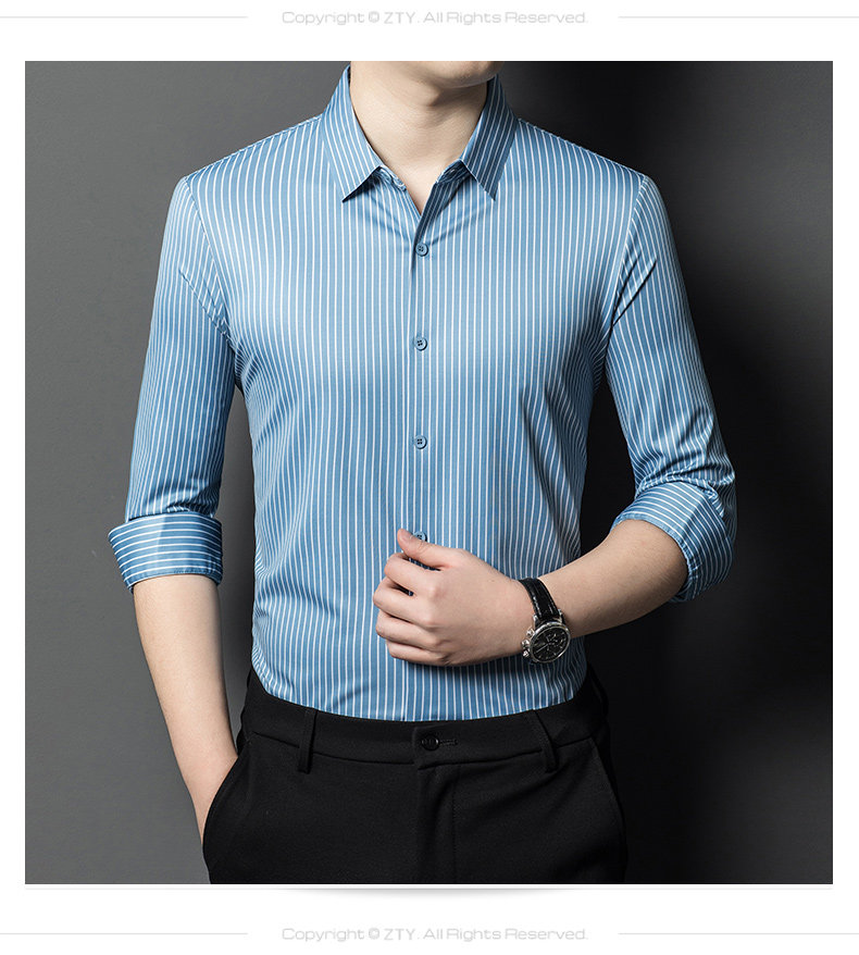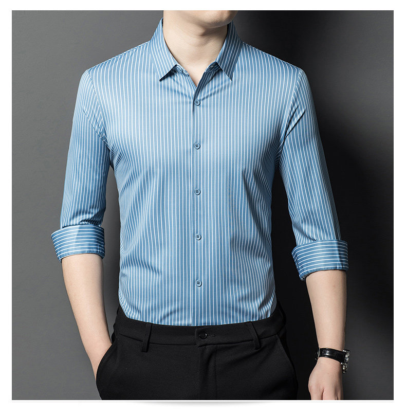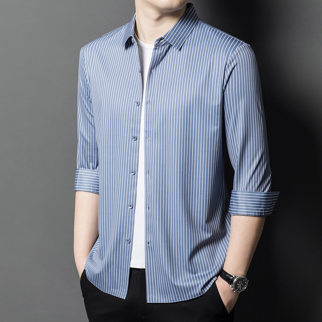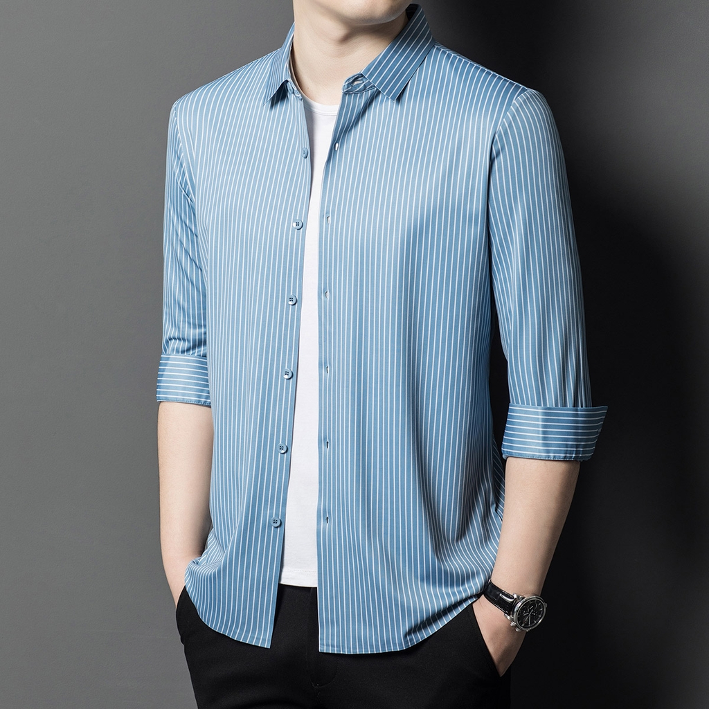 • Áo sơ mi nam làm từ lụa dâu tằm, mang đến cảm giác mềm mại và sang trọng. Phiên bản Hàn Quốc với thiết kế sọc dọc tạo phong cách tinh tế và hiện đại, phù hợp cho môi trường công sở và trang phục thường ngày.