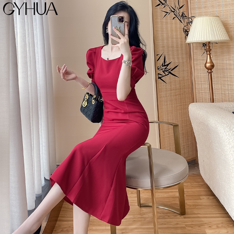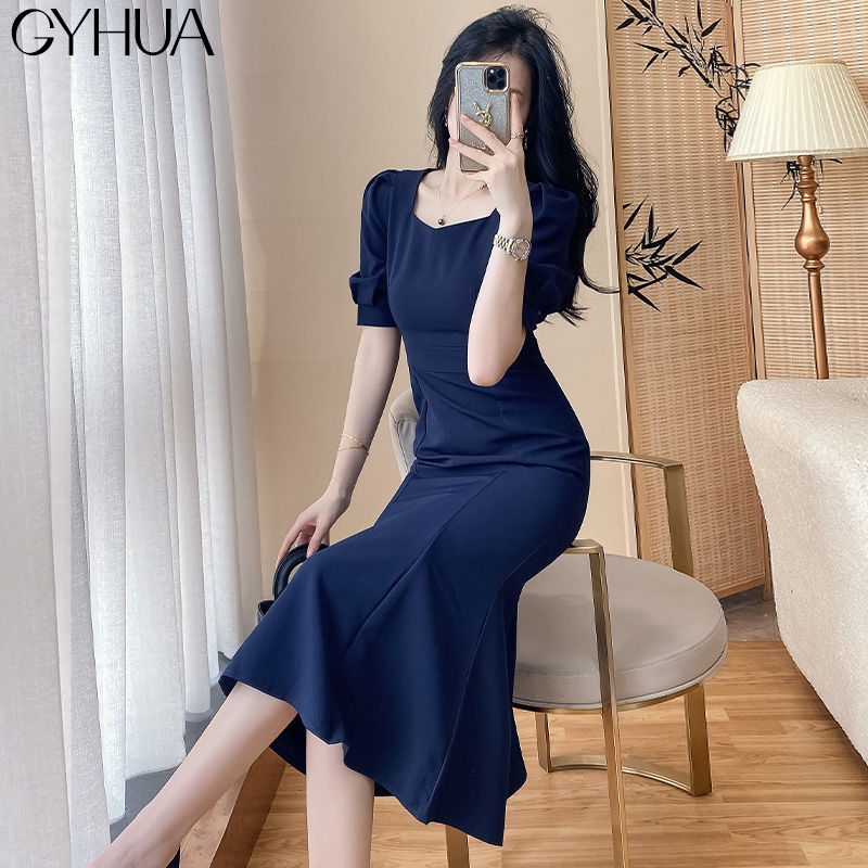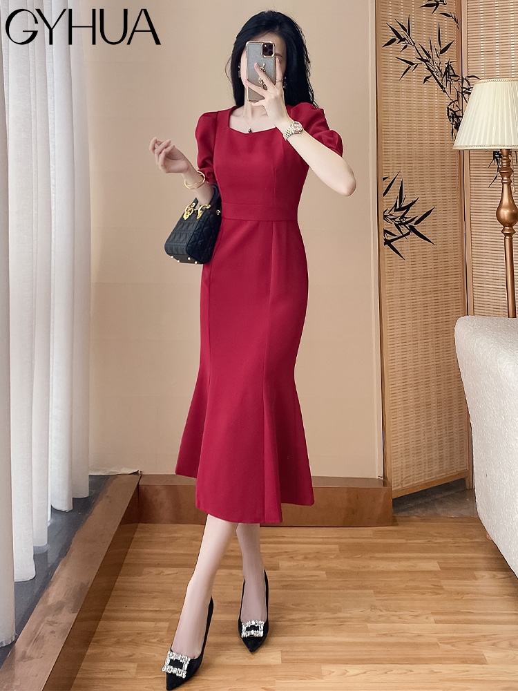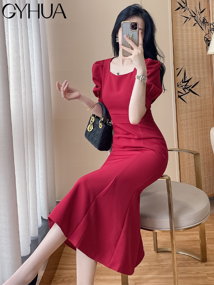 OE894: Váy dài tay bồng nữ mùa hè mới kiểu dáng sang trọng cao cấp dáng váy đuôi cá dáng dài ôm sát