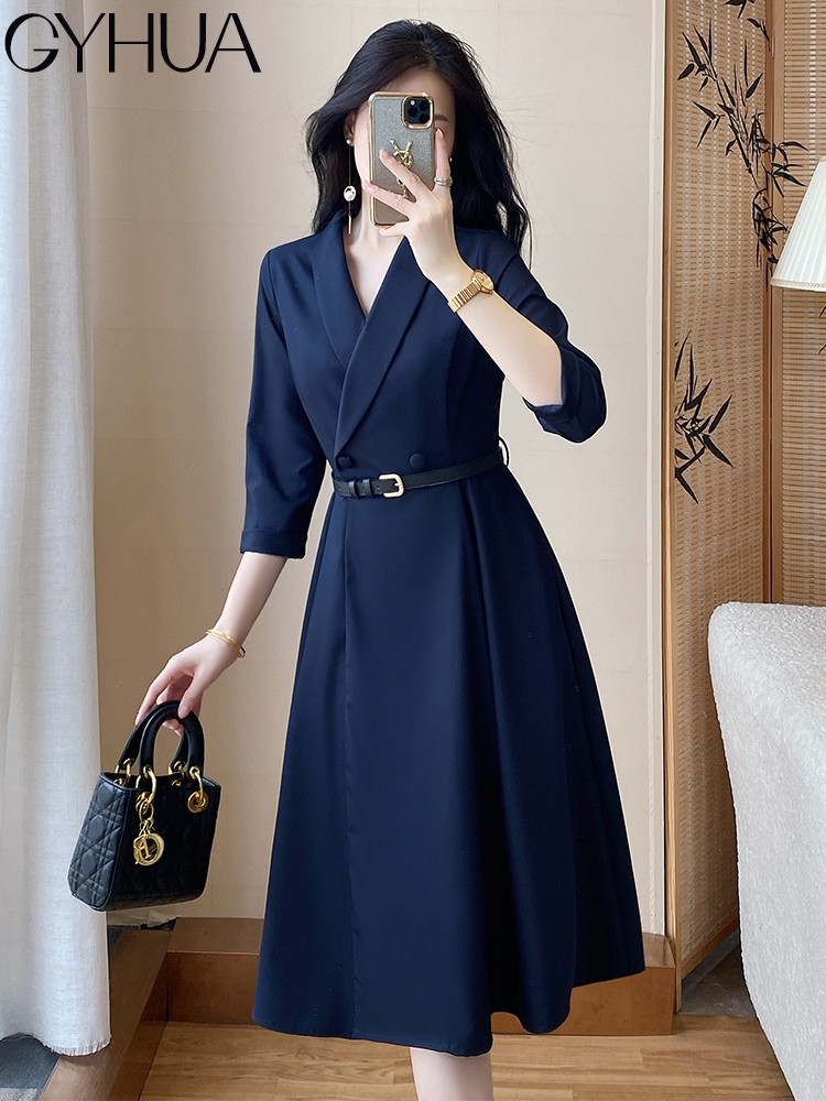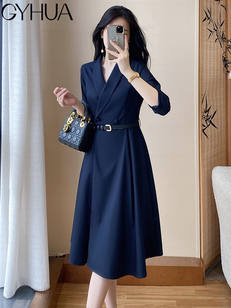OE911: Váy dài tay màu xanh navy cao cấp có eo tôn dáng